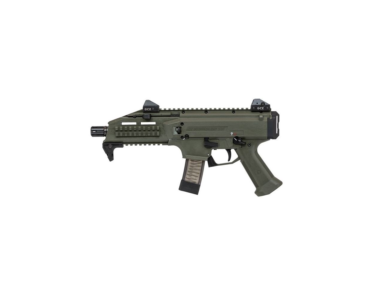 This CZ Scorpion sub-gun is a blowback-operated semi-auto in 9mm with a 7.75″ cold hammer-forged barrel. Its muzzle features 1/2×28 threads hidden underneath the factory flash hider, meaning users can fit either 1/2×28 or 18×1 accessories to the muzzle. Equipped with low-profile sights, its rear sight has four different aperture sizes for everything from close quarters to way out there. The sights ride on an 11″ Picatinny rail perfect for mounting optics. It has a polymer frame with a QD sling swivel pocket integrated into the rear sling attachment point. Simple and reliable, the Scorpion not only has ambidextrous controls, but its non-reciprocating charging handle is also swappable and trigger reach is adjustable. This model has an OD green metal finish.