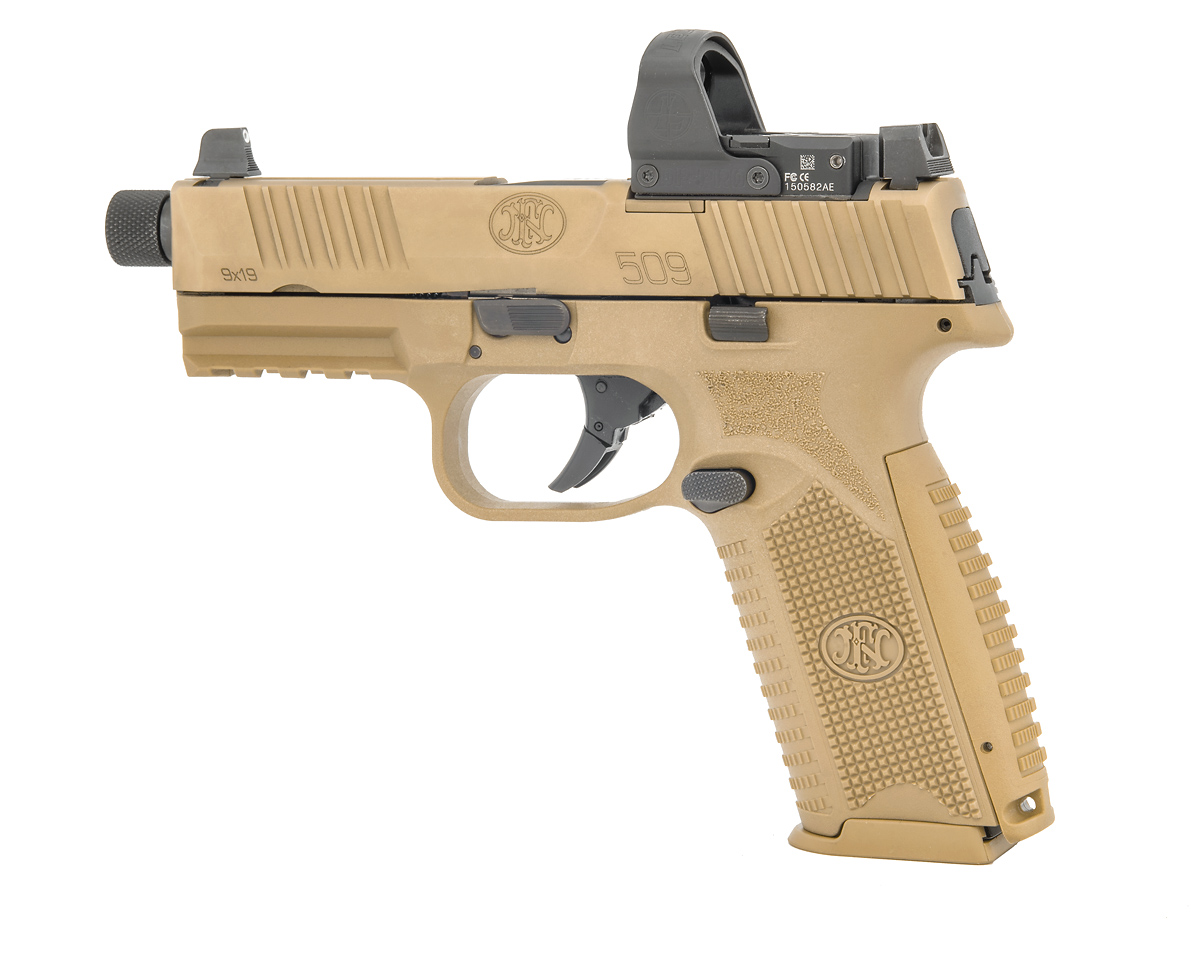 The FN 509® Tactical, an extension of the FN 509 family, is based on FN’s submission pistol that the U.S. Army tested for its Modular Handgun Trials but includes the significant improvements to the design that were implemented in the FN 509. The pistol features the company’s patent-pending Low-Profile Optics Mounting System™ that enables the platform to accept more than ten commercially-available miniature red dot (MRD) optics that co-witness with the suppressor-height night sights and remain adaptable to future optics releases with no requirement of direct milling of the slide. The slide cap, for use when not shooting with an optic, has raised sight wings that protect iron sight alignment if the pistol is dropped or jostled, and provides a textured ramp for racking the slide against a belt loop, pant pocket, or boot. An FN-signature 4.5-inch, cold hammer-forged, stainless-steel barrel with target crown, ½” x 28 threads that accept the bulk of 9mm suppressors available, and thread cap with integrated O-ring to prevent loosening during use complete the top end. Lastly, the 24-round magazines, nearly identical in length to the pistol’s slide, maximize ammunition capacity without impacting carry convenience.