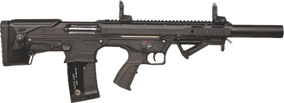 The Panzer Arms BP-12 Gen 2 semi-automatic shotgun has a compact design that still packs a punch. This bullpup 12-gauge firearm has its action and magazine positioned behind the trigger guard, which significantly reduces size and weight without compromising barrel length or ballistics. This firearm is an ideal choice for police, security, military, and home defense.