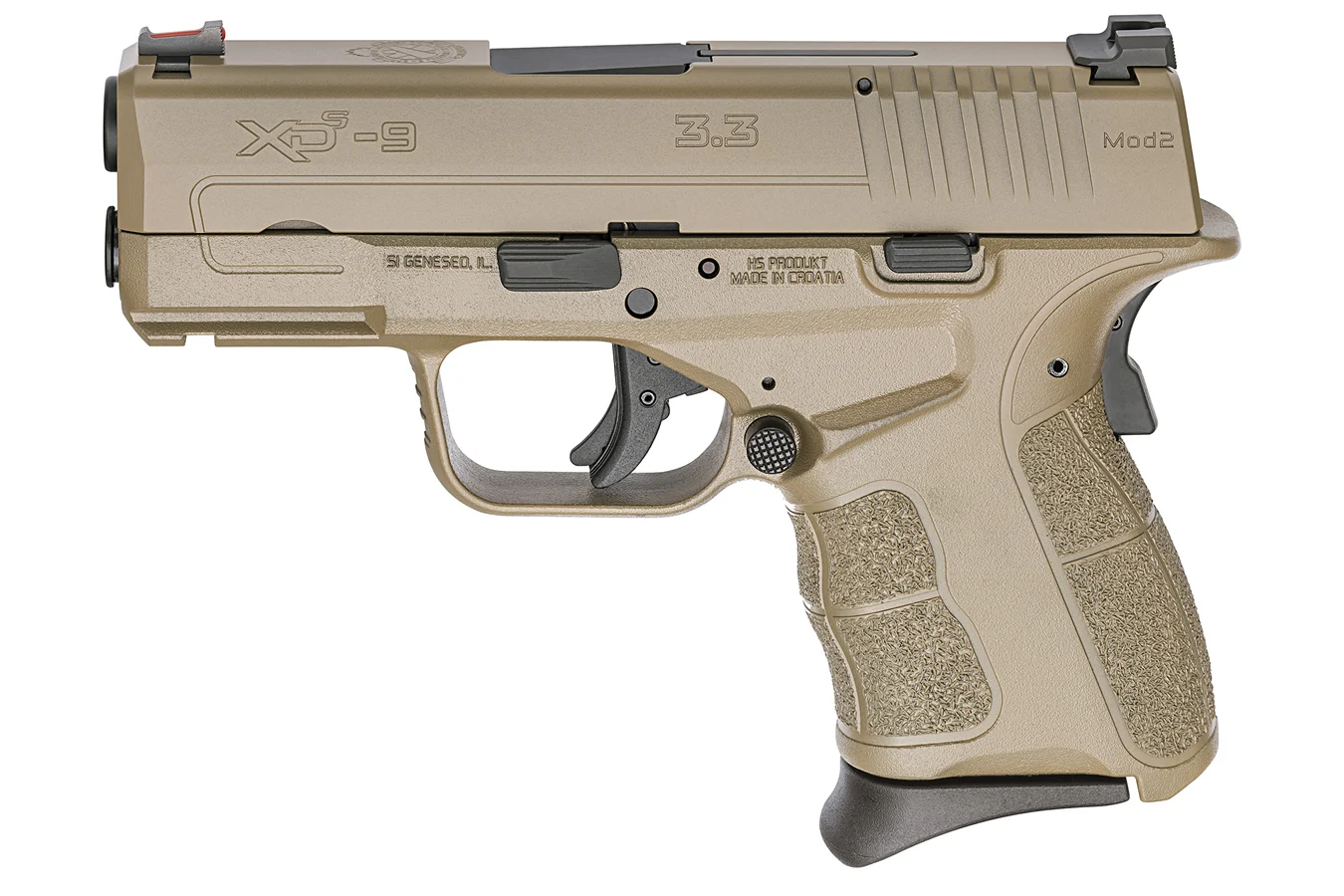 Springfield Armory’s XD-S Mod.2 offers upgrades from the inside out. It features a higher hand position, enhanced grip texturing, thinner slide, an fiber optic front sight with the tactical-rack rear sight, and an enhanced trigger advance this polymer-framed pistol’s acclaimed “point and shoot” ergonomics. Other features include a loaded chamber indicator and a grip safety that immediately readies the gun for action yet renders it virtually incapable of firing if dropped. This model features an FDE slide and a hammer-forged barrel. It comes with one (1) 7-round flush magazine and one (1) 9-round magazine with Mid-Mag X-Tension. Buy Guns Online EU